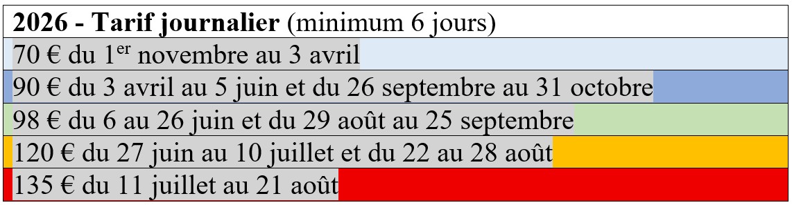 du 15 octobre au 31 décembre 2025 : 70 € la nuitée / 490 € la semaine